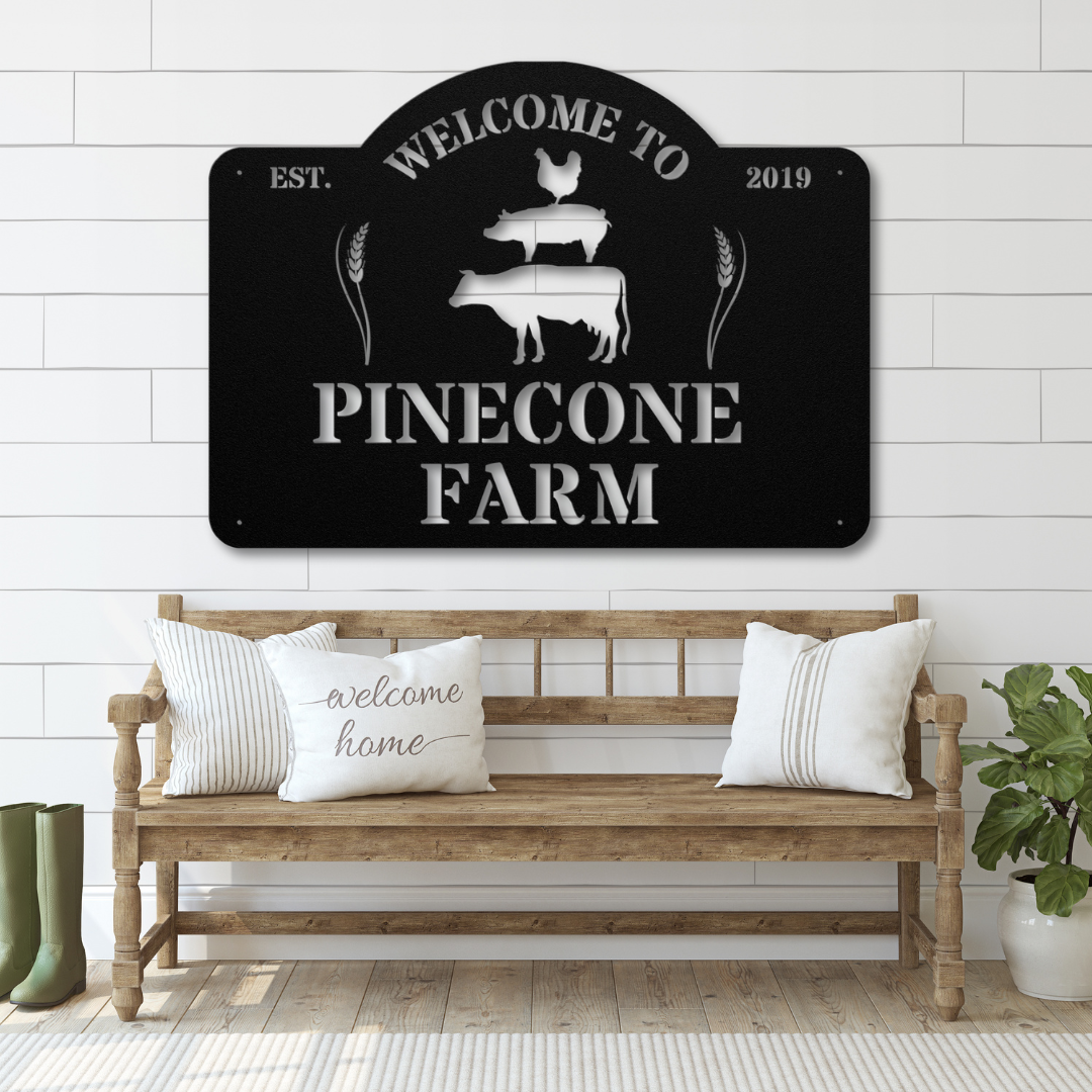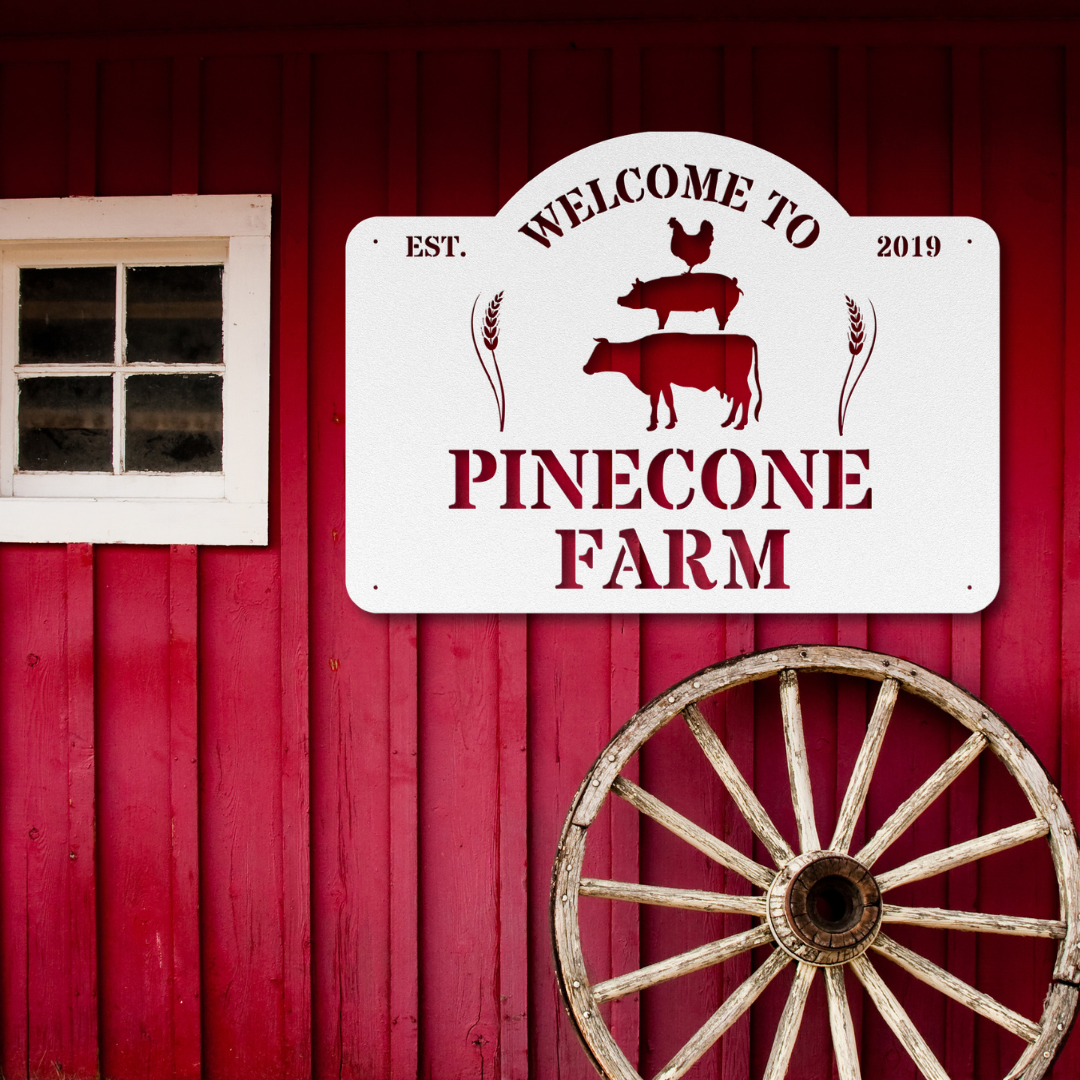 Welcome guests to your charming farmhouse with our Barnyard Welcome Personalized Steel Sign. Crafted from durable 18-gauge steel, this sign is built to endure, featuring a powder-coated finish available in five vibrant colors to match your style. The design showcases a silhouette of stacked farm animals along with the friendly "Welcome To" greeting, personalized with your farm name. Perfect for adding a unique and inviting touch to your property, this sign combines rustic charm with long-lasting quality, making it an ideal addition to your farmhouse entrance or barn.