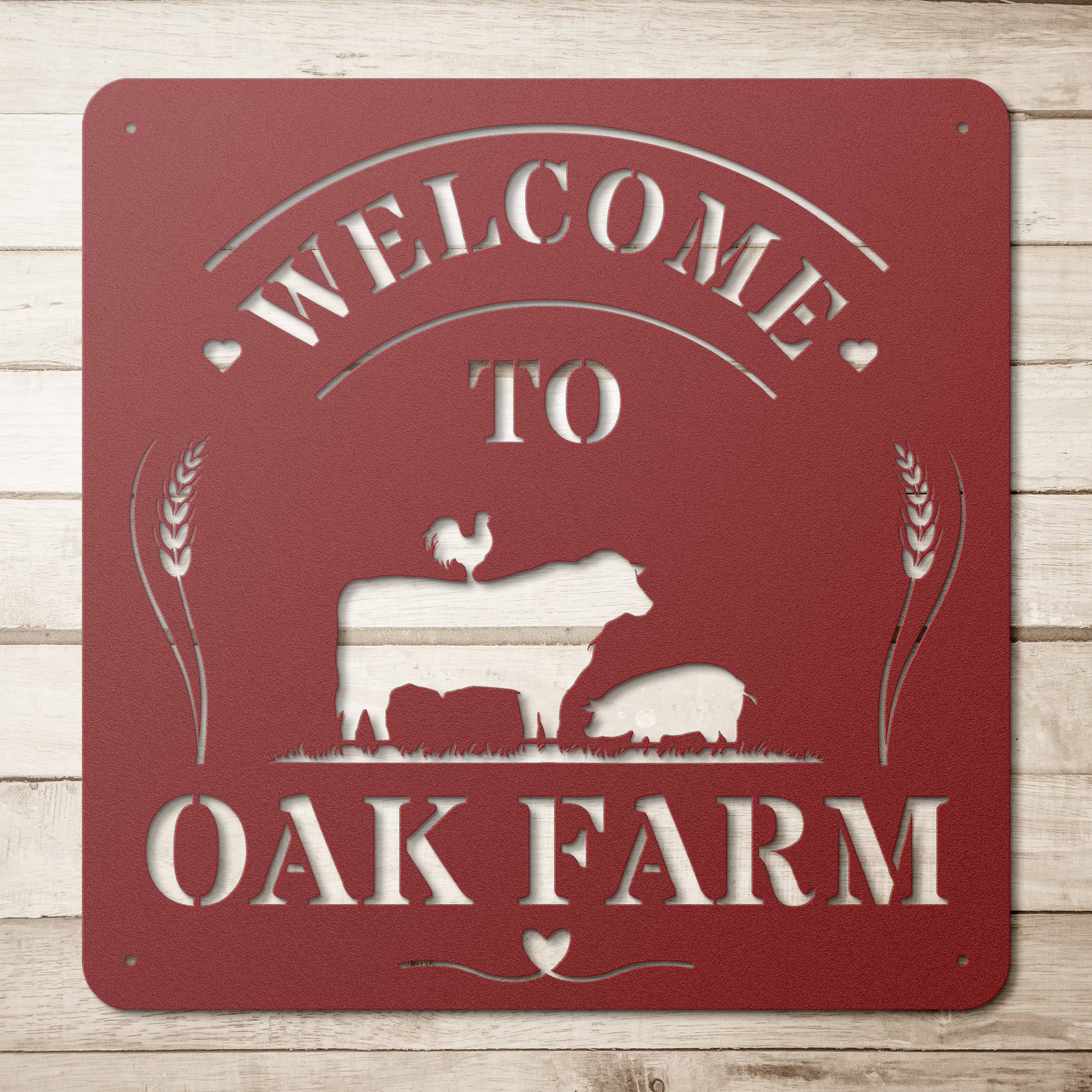 Welcome guests to your charming farmhouse with our Farmhouse Welcome Personalized Steel Sign. Crafted from durable 18-gauge steel, this sign is built to endure, featuring a powder-coated finish available in five vibrant colors to match your style. The design showcases classic farm animal silhouettes along with the friendly "Welcome To" greeting, personalized with your farm name. Perfect for adding a unique and inviting touch to your property, this sign combines rustic charm with long-lasting quality, making it an ideal addition to your farmhouse entrance or barn.