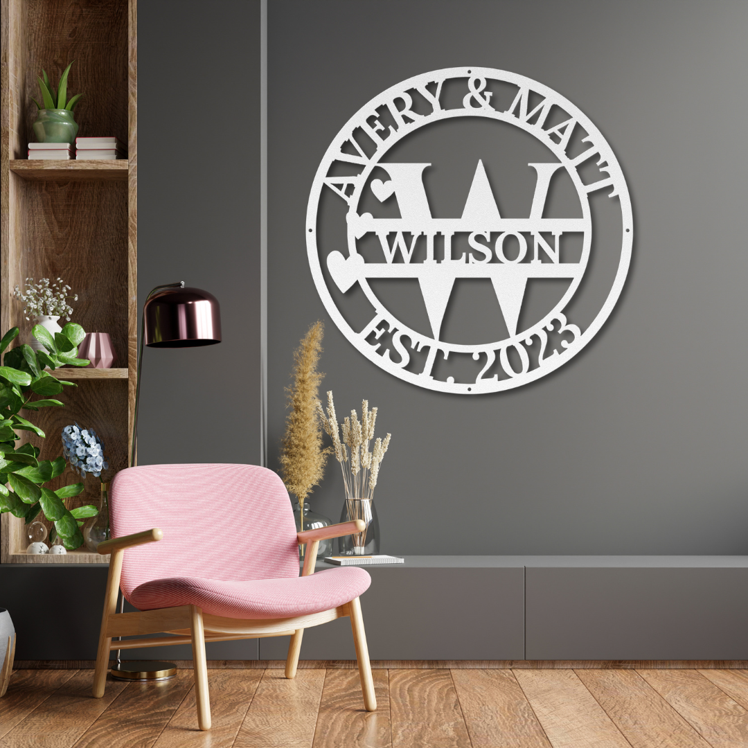 Elevate your home decor with our Hearts Name Monogram. Crafted from durable 18-gauge steel and expertly powder-coated, this stunning sign is built to last, withstanding the elements for years of enjoyment. And the cute heart design radiates a sense of joy and love, that will infuse any space with loving positive energy. Personalize this sign to make a truly sentimental and meaningful gift perfect for newlyweds and new homeowners.